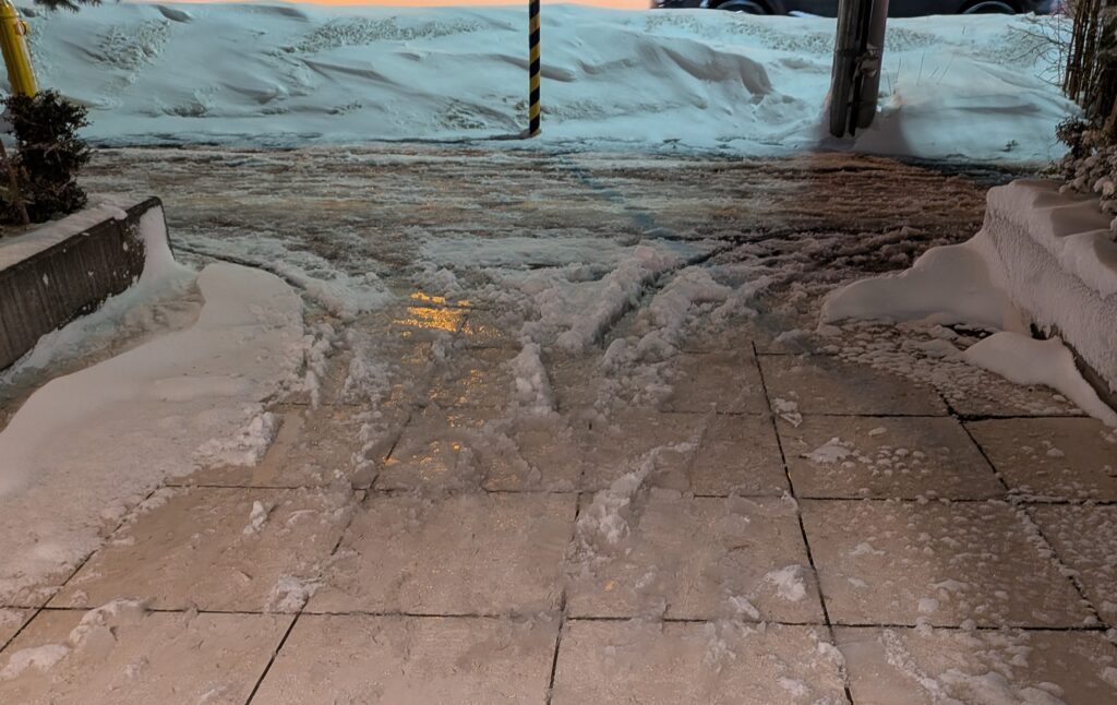 冬靴なし・丹田、すり足、歩幅小で乗り切った。